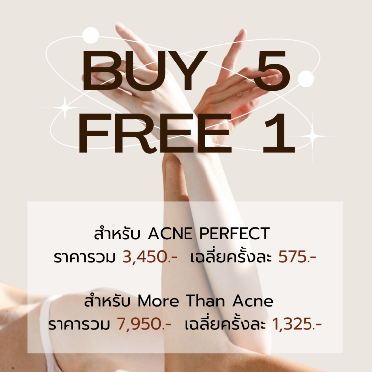 เมื่อซื้อ Acne Perfect หรือ More than Acne 5 ครั้ง ในราคาปกติ รับ 1 ครั้งฟรี ! โปรแกรมเดียวกับที่คุณลูกค้าซื้อ ทันที !
